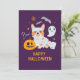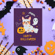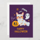 Den här söta Halloween-kortet har en lekfull illustration av en Corgi insvept i mumiebandage, omgiven av Halloween-element som en spöklik jack-o'-lantern, en vänlig spöke, fladdermöss och ett spindelnät. Mot en djup lila bakgrund sticker den ljusa orange "Glad Halloween"-texten ut, vilket gör det till ett roligt och festligt val för hundälskare och Halloween-entusiaster. Perfekt för att sprida Halloween-glädje med en touch av sötma!