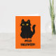 Spansk Halloween-kort. Glad Halloween (lycklig Halloween på spanska) kort. Text på spanska, Glad Halloween (lycklig Halloween på spanska) och Halloween-illustration. Meddelande inuti kortet, Glad Halloween (lycklig Halloween på spanska).