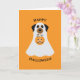 Illustration av en hund utklädd till spöke som går runt och bugar eller behandlar på Halloween.