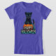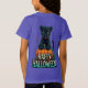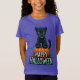 Söt svart panter kattunge som sitter på en ljus orange pumpa med turkosa blad ovanför fet leopardmönstrad “Glad Halloween” text. Lekfull, festlig och fantasifull konst idealisk för säsongskort och dekorationer.