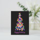Ett fet, modernt vykort för helgdag har ett originellt, färgstarkt, abstrakt foto av dimmig ljus. Den båge som skapades från ljus rosa, rött, orange, blått, grönt och gult utgör formen av ett Julgran. Under träd står "glad helg" i ett skript för rosa av mörk. Lodräts bakgrund är svart. Om du vill se fotografiet Oskarp jul-Ljus på andra objekt klickar du på länken "Rocklawn Arts" nedan. Digital, färg-fotografi. Copyright ©Claire E. Skinner. Alla höger reserverade.