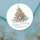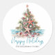 Beach Julgran Classic Round Sticker. Sprid lite kusttuggare med detta fylliga runda dekal som innehåller en strandinspirerad Julgran som är gjord av sjöhäckar och som fylls med en stjärnfisk. Perfekt för att skicka beachy helgdag är detta dekal underbart för alla som bor i tropiska ställe som Hawaii eller för dem som kärlek ett kustlevande vibe. I designen visas träd som är centrerat på en sandbas med mjukt tealjon vinkart i bakgrunden. Under träd är "Glad helg" skript i elegant, vilket ger en festlig beröring. Den rustiska vattenfärgen stil och blandningen av enkel typografi och skript ge är en avslappnad som ännu är polerad. Perfekt för dekorering av julkortskuvert, party favors eller helgdag med en tropisk skevning.