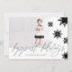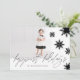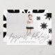 Chic, modernt och snyggt svartvitt fotokort för helgdag med minimal och djärv snöflingdesign. Har en enda familjefollayout för att visning ditt eget speciella helgdag-foto. Fet och elegant snöflingor-kaskad från kortets överkant med "Happiest Helgdag" som visas i modern kalligrafi. Baksidan har en bakgrundsdesign för snöflingor i abstrakt i svartvitt. Alla illustrationer är handritade originalbilder av Moodthology Papery.