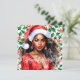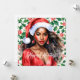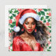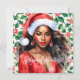 Vattenfärgsgrafik har en vacker brun hud kvinna som bär en julhatt, örhängen och röd klänning parad med texten "Glad helg" mot en baksida av poinsettia mönster. Underbar för julhelgen! Visa upp din julstämning med den här söt svarta kvinnan Santa-grafiken. Obs! anpassade för text + bakgrund osv.