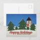 Fyra lycklig evergreen träd dekorerat i rött och guld sitter på en snöhög med ett enda familjehem i bakgrunden. En perfekt som en återförsäljare vill önska sina kunder Glad helg!