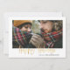 Glad helg guld-skript och rött tartan-kort. Med plats för fotografi.
