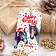 Glad helg hästar Juletiketter, vattenfärg två vackra hästar med rödtomhatt och konfekt som faller över