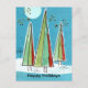 Ett hälsningskort i glad helg med tre århundraden av modern utformning av stil träd i snö, med atomiska stjärnor i himmel som flyter runt fullt i måne på en ljusblå vattenfärg tvättat bakgrund.