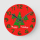 Den befintliga bakgrunden till klockan är en röd jul, men kan ändras till valfri färg genom att klicka på Redigera design. Stora siffror i en grönt gör det enkelt att se tiden från andra sidan rummet. Festive grönt träd är centrerat bakom klockan händer. Texten "Glad helg" är vit och kan ändras eller tas bort. Du kan också ändra teckensnittets färg eller stil genom att använda knappen Redigera design. Den här designen visas på en rund klocka, men fungerar också på den fyrkantiga formen eller överförs till en klocka om du vill.