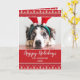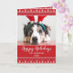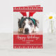 Glad helg med ett rött och vitt mysigt nordiskt Mönster med gräs träd. Visa av hund, katten eller alla sällskapsdjur, eller så kan du också visa dina barn eller familjefoto. Lägg till ditt efternamn eller efternamn med datumet om du vill. Ha roligt och ha en Lycklig-Julhelg. Fotobilden Australian shepherd hund kan ändras eller lämnas som den är. Budskapet i kortet säger: Ha en roligt och festlig julhelg! Du kan lämna som det är eller anpassa det och ändra det.