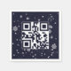 Svartvit QR-kod som läser Glad helg på en svart bakgrund med utspridd snöflingor.