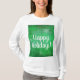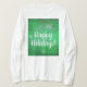 "Glad helg" är skrivet i ett typsnitt som kan anpassas efter kostym. Tre ömtåliga snöflingor dansar om gröntens bakgrund.