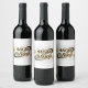 Tre vin flaskor med festliga Glad helg-etiketter.