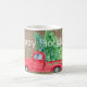 Bakgrund och vattenfärg för vintage röd lastbil som är utklistrad för helgdagarna med färskskskuren Julgranar. "Glad helg" i rustik teckenövertäckning