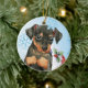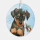 Fira julhelgen med en gullig miniatyrPinschervalp i en Santa hatt amid snöflingor med ord, lyckliga Howlidays, på baksidaen! Underbar helgdaggåvaidé för minimum Klämma fastälska familj och vänner.