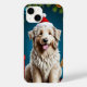Glad hund med en fluffig päls, iklädd en festlig röd och vit tomtehatt. Hunden sitter framför en livfull bakgrund som inkluderar gröna tallgrenar behängda med färgglada juldekorationer i olika storlekar—röda, blå och gyllene. I närheten finns vackert inslagna presenter i rött och blått, som ytterligare förstärker jultemat. Scenen är varm och glädjefylld och fångar essensen av en festlig firande.