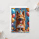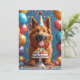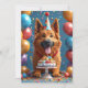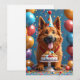 En glad hund som bär en festhatt njuter av en födelsedagsfirande med en livfull tårta och festliga dekorationer, vilket skapar en glädjefylld, festlig stämning.