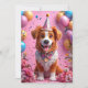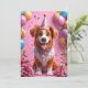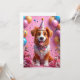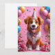 En glad hund som bär en festhatt njuter av en födelsedagsfirande med en livfull tårta och festliga dekorationer, vilket skapar en glädjefylld, festlig stämning.