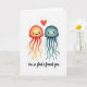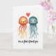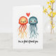 This greeting card shows two cute jellyfish characters on a plain white background, facing each other like they’re sharing a sweet moment. One jellyfish is painted in orange and golden yellow, with long tentacles that look like they’re gently floating. The other is done in teal and ocean blue, with flowing tentacles that mirror the same soft motion. Both have big happy smiles, bright curious eyes, and small rosy cheeks that make them look truly fond of each other. A red heart floats above them in the center, making the love theme clear right away ❤️. Under the jellyfish, the words “I’m so glad I found you” appear in a black script style, placed near the bottom of the card like a personal note 💌. The watercolor look is light and see-through in places, with soft edges that keep the scene calm and sweet 🍫.