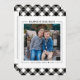 Dela dina lyckligaste stunder med denna moderna svart-vita buffel-checkade högtidliga design, med en djärv "God Jul" hälsning, ett inramat framsidesfoto och ett koordinerande baksida med en flerbilderkollage och matchande rutmönstrade kanter. Ren typografi och en neutral färgpalett håller fokus på dina familjefoton medan det fortfarande känns festligt för jul och vintersäsongen.