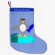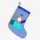 Denna fantastiska julstrumpa har en söt liten grå och vit pingvin med svarta ögon och gul näbb och fötter. Pingvinen håller en stor blå fisk med en vinge och står på en blekblå isklump. Det finns en öppen present bredvid pingvinen komplett med ett festligt band. Det finns anpassningsbar text högst upp på strumpan så att den kan anpassas.