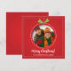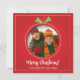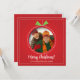 Sprid julglädje med detta anpassningsbara julkort. Med en enkel illustration av en julgransprydnad bunden med ett grönt band och mot en gnistrande röd bakgrund, erbjuder detta kort utrymme att lägga till en personlig julhälsning, familjenamn och ett älskat familjefoto. Perfekt för att skicka julhälsningar till familj, vänner och nära och kära. Skapa ett unikt vykort med denna lättanpassade mall.