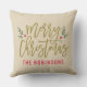 En varm beige kastkudde med stor "Glad jul" i guld penselskrift med ömtåliga julbärsgrenar och ett familjenamn i rött nedan. Den tonala guld-på-beige paletten skapar en mjuk, sofistikerad jullook med vintage charm. Personifiera med ditt familjenamn för en mysig julaccent eller genomtänkt julpresent. Matchar vackert med neutral och jordnära säsongsdekor.