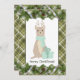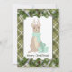 Här är en fantasifull design som börjar med en grön julplaid. De övre och nedre grenarna av gran, dekorerade med snöflingor, band och kottar. I mitten finns en hjort med en present. På baksidan av kortet finns en textruta där du kan lägga till ditt julmeddelande. Om du föredrar det kan du ta bort texten och skriva ditt eget meddelande.