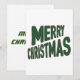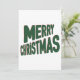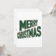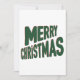 Denna inbjudan visar orden "Glad jul" i en fet stil med gröna bokstäver och röd kontur med olika storlek på bokstäverna i bakgrunden i detta jul-tema och stil. Tryckt på ett klassiskt, runt papper med 17,5 pt tjocklek och en obestruken mat finish med en äggskalstruktur tillverkad och tryckt i USA med "Glad jul" tryckt på baksidan.