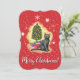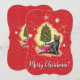 Detta är en söt juldesign med livfull röd bakgrund full av stjärnor och små snöflingor och med en vacker katt framför ett julgran. Skicka dina kärleksfulla, mysiga, firande vibrationer till dina nära och kära!