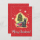 Detta är en söt juldesign med livfull röd bakgrund full av stjärnor och små snöflingor och med en vacker katt framför en julgran. Skicka dina kärleksfulla, mysiga, firande vibrationer till dina nära och kära!