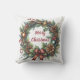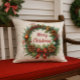 Välkommen gäster till ditt hem med en Glad jul soffkudde på verandan. Denna kudde har en akvarellillustration av en festlig julkrans och en Glad jul hälsning. Kransen skapades med hjälp av AI-verktyg och designades av Susang6.