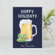 Målad ölmugg och klasar av humle på festlig blå med matchande mönster på baksidan, rolig "Glad jul"-kort.