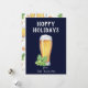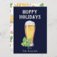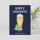 Målad ölbryggning och kluster av humle på festlig blå med matchande mönster på baksidan, rolig "Glad jul ölbryggning" kort.