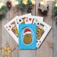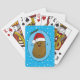 Bedårande rolig söt lycklig brun seriefigurspotatis som bär en röd och vit tomtehatt. Potatisen är i en seriefigurstil och färgad brun, han har pinnarmar och fingrar och en stor lycklig leende med prickar för ögon. Tomtehatten på hans huvud är röd med en vit kant och en vit pompom som hänger ner. Han är inuti en ljusblå oval form med en mörkblå ram och två gröna julgranar med två röda bär högst upp på ovalen. Bakgrundsfärgen är en ljus klarblå med vita snöflingor som flyter omkring för att ge en festlig känsla till dessa söta säsongsbetonade spelkort.
