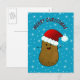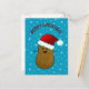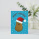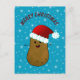 Glad jul potatis, med en ljusröd tomtehatt. Blå bakgrund täckt med vita glittrande snöflingor.