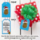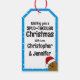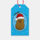 Bedårande rolig söt lycklig brun seriefigur-potatis som bär en röd och vit tomtehatt. Potatisen är i en seriefigur-stil och färgad brun, han har pinn-armar och fingrar och ett stort lyckligt leende med prickar för ögon. Tomtehatten på hans huvud är röd med en vit kant och en vit pompom som hänger ner. Han är inuti en ljusblå oval form med en mörkblå ram och två gröna julgranar med två röda bär högst upp på ovalen. Bakgrundsfärgen är en ljus klarblå med vita snöflingor som flyter omkring för att ge en festlig känsla till denna söta säsongsbetonade presenttagg. På baksidan av taggen finns textmallar som kan lämnas som de är eller ersättas med ditt eget meddel