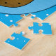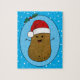 Bedårande rolig söt lycklig brun seriefigur-potatis som bär en röd och vit tomtehatt. Potatisen är i en seriefigur-stil och färgad brun, han har pinn-armar och fingrar och ett stort lyckligt leende med prickar för ögon. Tomtehatten på hans huvud är röd med en vit kant och en vit pompom som hänger ner. Han är inuti en ljusblå oval form med en mörkblå ram och två gröna julgranar med två röda bär högst upp på ovalen. Bakgrundsfärgen är en klar ljusblå med vita snöflingor som flyter omkring för att ge en festlig känsla till dessa söta säsongspussel.