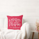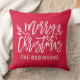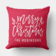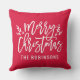 En djärv röd kastkudde med stor "Glad jul" i vit borstskrift med ömtåliga julbärsgrenar och ett familjenamn nedan. Den livfulla röda bakgrunden och den skarpa vita bokstaven skapar ett glatt, iögonfallande julpåstående. Personifiera med ditt familjenamn för en festlig julaccent eller present. En framstående pjäs för julsoffor, fåtöljer och säsongssamlingar.