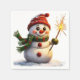 En festlig snöman prydd med röd hatt och röd halsduk under en snöig vinter.