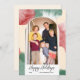 Detta julkort har en modern valvbilder på en röd, grön och krämfärgad akvarellbakgrund. Designen är accentuerad med handstils text och har en koordinerad krämfärgad baksida. Foto © Storytree Studios, Stanford, CA