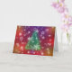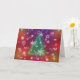 En spridning av vita snöflingor, järnekblad och bär, stjärnor och tallar mot en glödande bakgrund av rött, orange, guld och lila, med en mjuk grön julgran i mitten.