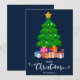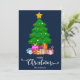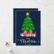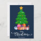 Mörkblå God Jul i typsnitt med skrivstil med en grafik av en julgran och inslagna presenter under den design. Detta blå bakgrundsfärg julkort är utformat så att du kan ändra bakgrundens färg och även ange ditt familjenamn. Du kan också redigera denna design för att ändra färgen på ordet "Jul" om du vill.