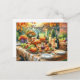 Det här julkortet visar en digital illustration av en Thanksgiving-middag. Middagen serveras utomhus på ett bord dekorerat med ett rutigt bordduk, blommor och ljus. Personifiera hälsningen eller köp som visat med "Glad Thanksgiving" i ett skrivstil-font. AI-bild designad av Susang6