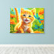 En söt orange tabbykattunge som leker i en blomsterträdgård med färgglada trollsländor.