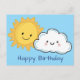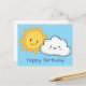 Kawaii vykort med en gul solsken och en fluffig vit moln på en blå bakgrund. Både solen och molnet har glada leende ansikten. Belo är en mall som läser god födelsedag som du kan använda som den är eller ersätta med ditt eget meddelande.