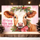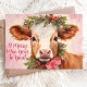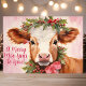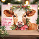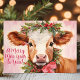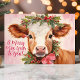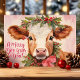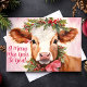 Önska dina nära och kära ett "Glatt Ko År" med det här förtjusande julkortet som visar en bedårande ko med en festlig julkrans och en rosa rosett. Det lekfulla ordspelet och konens söta uttryck kommer att locka ett leende på vem som helst. Det här unika och glada kortet är det perfekta sättet att sprida julglädje och skicka varma önskningar om ett gott nytt år.