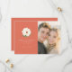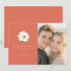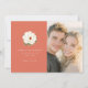 Denna bröllops-"spara-datum"-design har en delad layout med en varm korallbakgrund till vänster och en mjukfokus-fotografiruta till höger. Designen inkluderar en stor, elegant vit blommillustration centrerad ovanför anpassningsbar text i en blandning av seriffer och sans-serif-teckensnitt, vilket skapar en modern men ändå romantisk känsla. Färgpaletten kombinerar lugnande korall med krispigt vitt och subtila gröna toner, vilket förstärker den glada och festliga stämningen. Perfekt för par som vill tillkännage sitt kommande bröllop med stil och enkelhet, balanserar denna design grafiska element med fotografisk charm.