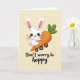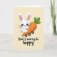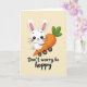 Det här kortet har en blekgul bakgrund med en stiliserad vit kanin centrerad i scenen, med runt ansikte vänt framåt med stora svarta ögon, en liten röd näsa och öron med rosa kanter. Kaninen kramar en överdimensionerad orange morot som en nära vän, med armarna insvepta i ett trångt grepp som uttrycker tillgivenhet och lite flörtigt 🐰. Moroten är tecknad som en sällsam liten åktur med fyra mörka cirkulära hjul, vilket ger scenen en mjuk känsla av rörelse. Mjuk skuggning och milda övertoningar ger djup åt kaninens kinder, morotens kurvor och hjulen, och håller utseendet mjukt och mysigt. En kort, pun-artad fras sitter under illustrationen i mörk bokstavsstil, placerad lågt och centrerad så att bilden förblir huvudpunkten. Varma crèmetoner blandas med klar orange och en touch av grönt