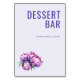 Denna bröllopsdekoration för bordet har en minimalistisk design med en ljuslavendelbakgrund som skapar en inbjudande atmosfär. Den djärva, djupvioletta texten lyder "DESSERT BAR", medan den mindre, ljusare violetta texten nedanför säger "please take a treat!" i ett rent sans-serif-teckensnitt. En realistisk men stiliserad illustration av proteablommor lägger till en touch av elegans i det nedre vänstra hörnet. Den harmoniska färgpaletten och den balanserade kompositionen förmedlar en glad och välkomnande stämning, perfekt för att förhöja din dessertstation på alla festligheter.
